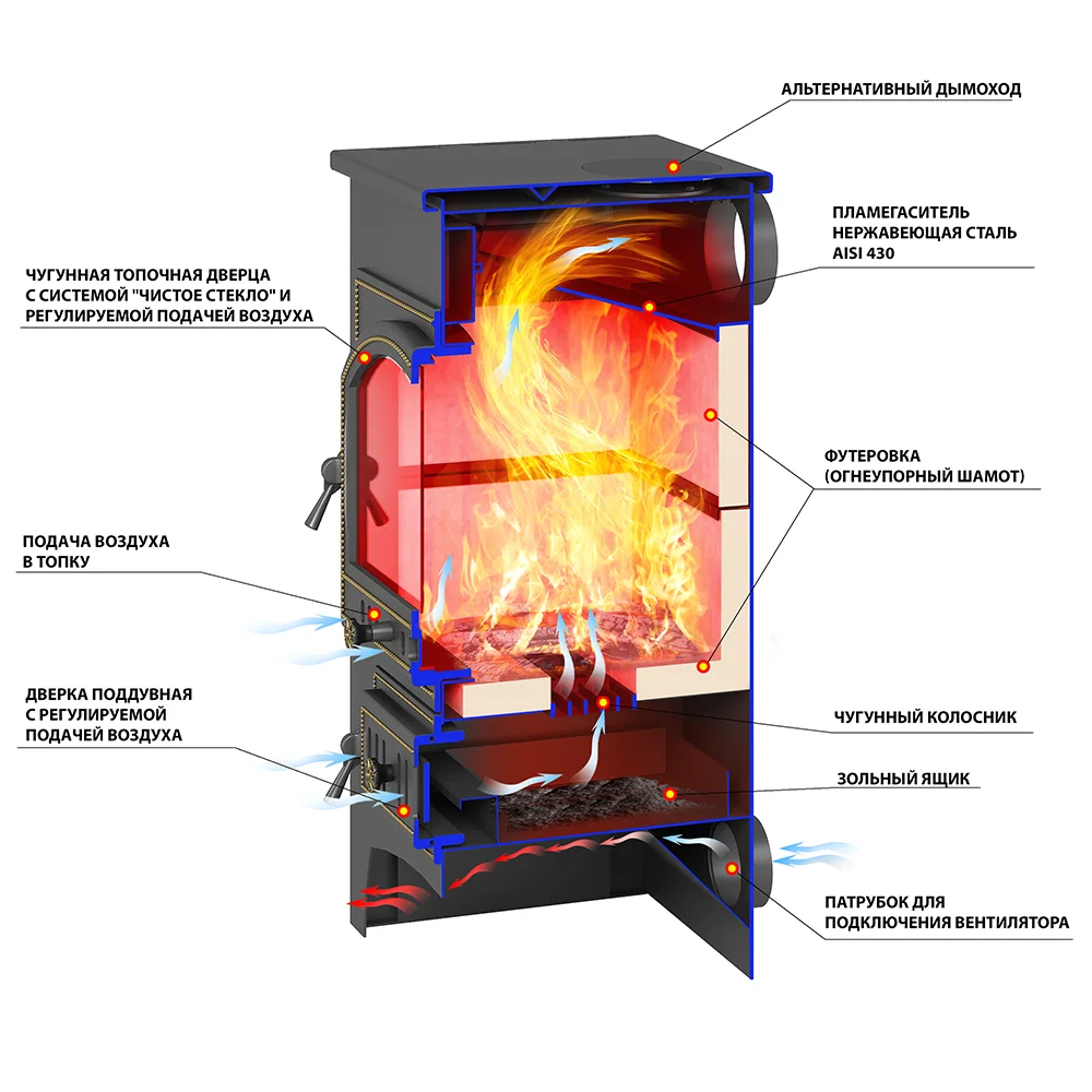 3. Чугунная поддувальная дверь с системой регулировки режимов горения.