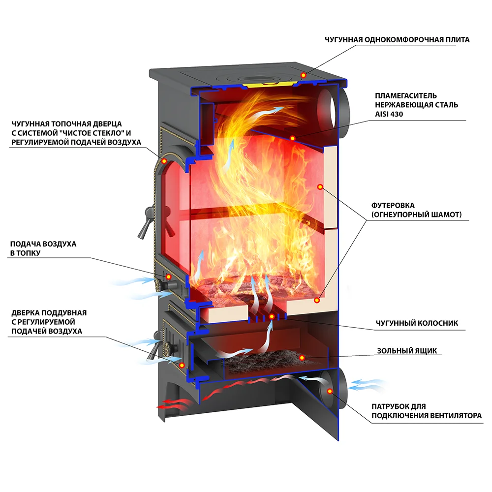 - Чугунная поддувальная дверь с системой регулировки режимов горения.