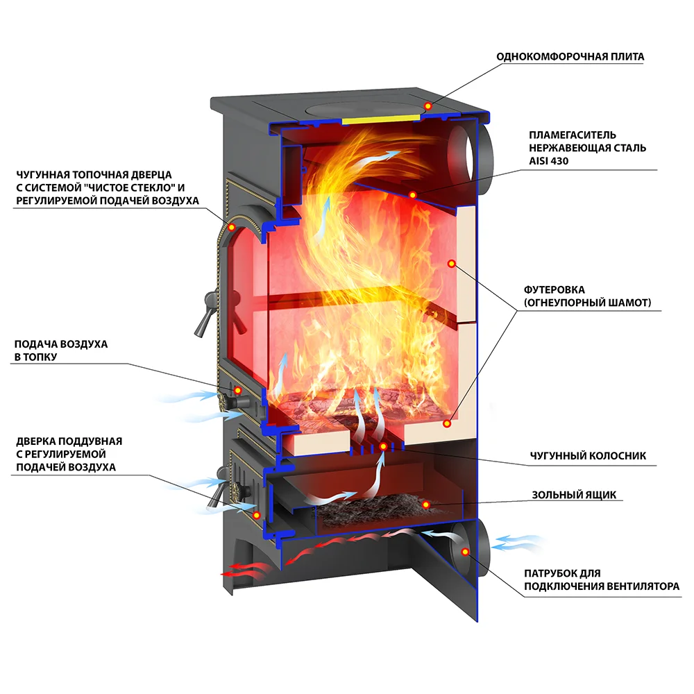 3. Чугунная поддувальная дверь с системой регулировки режимов горения