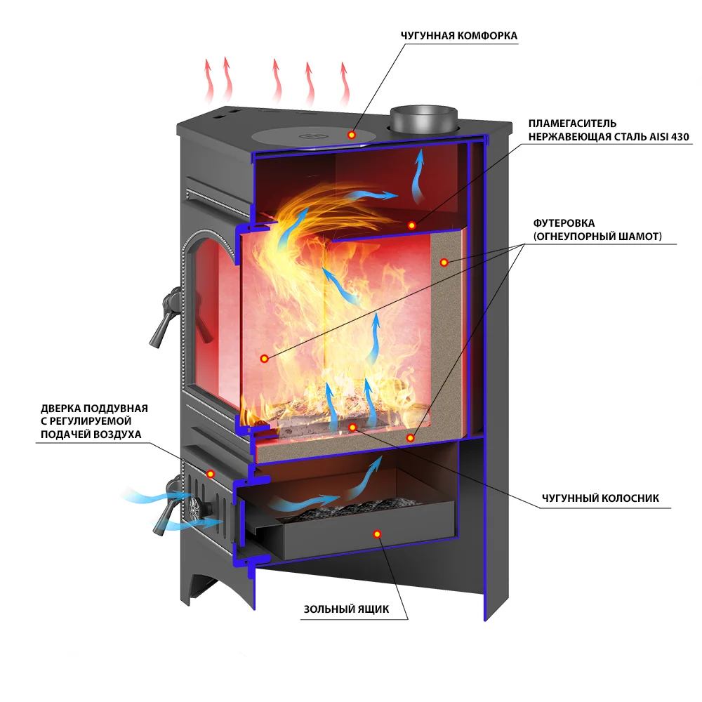 - Чугунная поддувальная дверь с системой регулировки режимов горения.