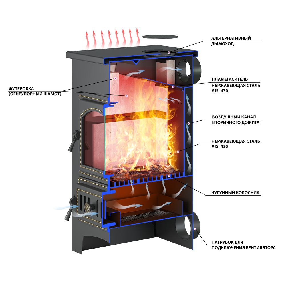 - Чугунная поддувальная дверь с системой регулировки режимов горения.