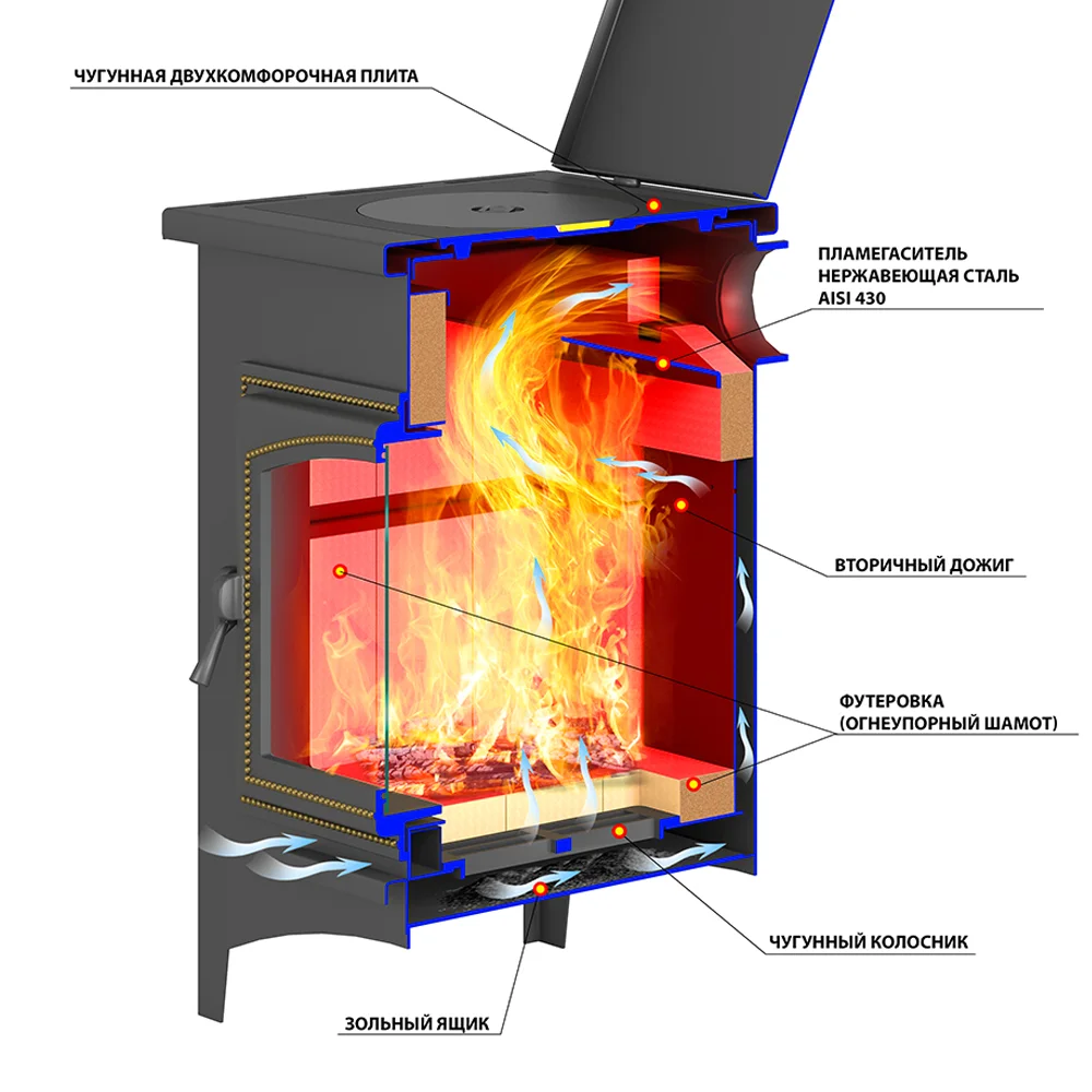 Печь-Камин ВЕЗУВИЙ ПК-04 (240) предназначена для бытового использования и рассчитана на установку в различных хозяйственных и жилых помещениях.Мощность печи-камина составляет 12 кВт и позволяет отопить помещение до 200 м3.Печь-камин ВЕЗУВИЙ ПК-04 (240) изготовлена из специальной конструкционной стали. Модель укомплектована чугунным колосником и чугунной герметичной дверцей Везувий 240, это выгодно отличает ВЕЗУВИЙ ПК-04 (240) от аналогов с металлическими дверками, которые подвержены деформации из-за высоких температур и перестают равномерно прилегать к топочному проему, тем самым нарушая герметичность печи, а наличие большого жаропрочного стекла позволяет контролировать процесс горения и любоваться «живым огнем».Топка печи-камина футерована легкозаменяемым, высококачественным шамотом, что защищает металл топки от воздействия высоких температур, продлевая тем самым срок службы печи, к тому же шамот отлично аккумулирует тепло, позволяя обогревать помещение в течении 2-х часов, после окончания топки печи.Наличие верхней чугунной плиты, с двумя комфорками, позволяет использовать печь-камин для приготовления пищи. Боковые стенки печи-камина ВЕЗУВИЙ ПК-04 (240) облицованы керамическими вставками, обеспечивающими естественную конвекцию воздушных потоков, что позволяет быстро прогреть воздух в отапливаемом помещении, к тому же, керамические вставки защищают окружающее пространство от воздействия «жесткого» инфракрасного излучения.После прогрева помещения до необходимой температуры, интенсивность процесса горения можно регулировать с помощью «зольника», прикрывая его для ослабления мощности горения, или приоткрывая, для усиления. Таким образом в данной модели печи-камина реализован режим «длительного горения», который составляет до 5 часов на одной закладке топлива. Срок службы не менее 10 лет