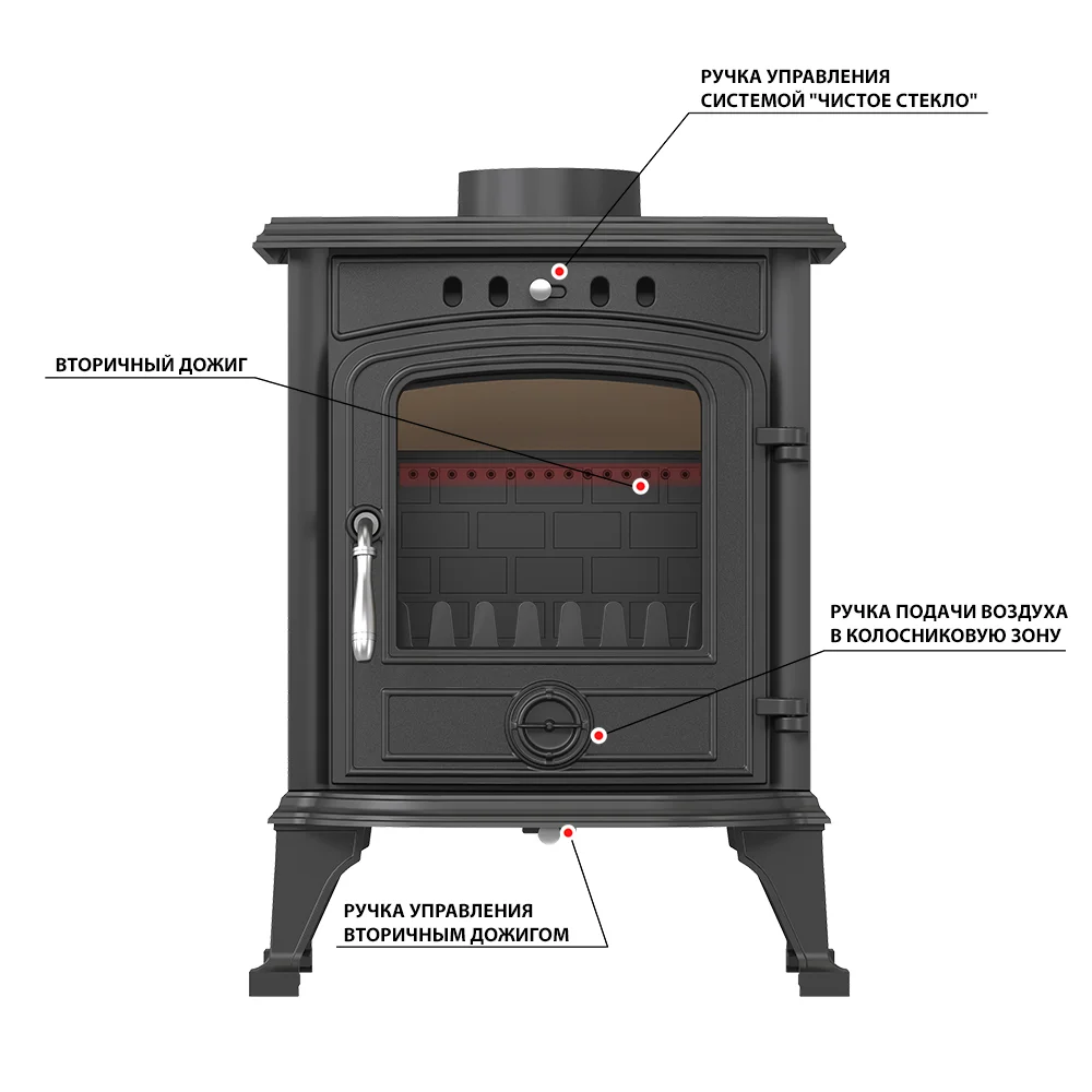 Над дверцей печи-камина расположена система чистое стекло, которая помогает оставаться стеклу чистым. В нижней части дверцы расположена ручка для регулировки подачи воздуха в колосниковую зону.