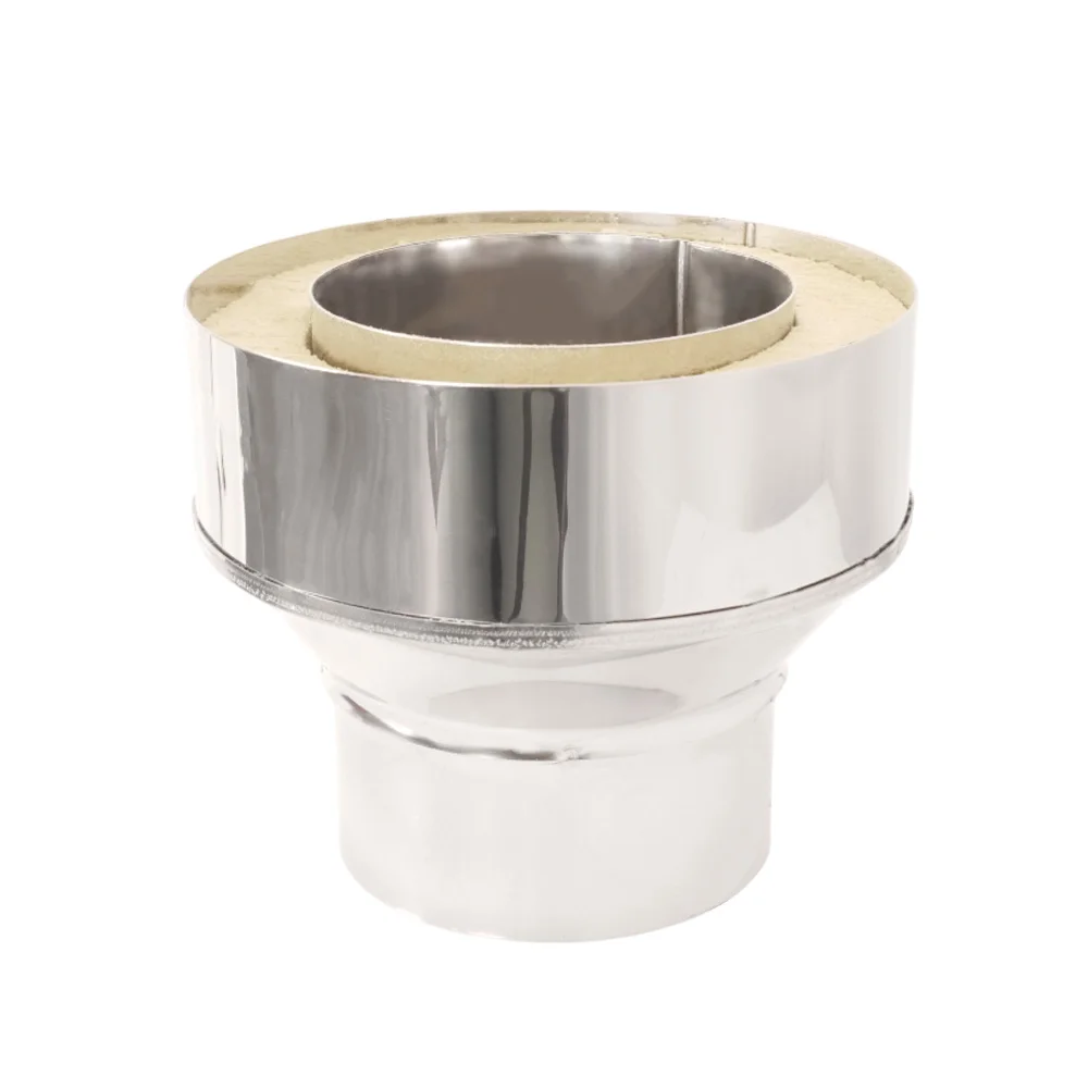 Переходы устанавливается при переходе с неутепленной системы на утепленную (с одноконтурного дымохода на двухконтурный). Элемент дымохода "Переход на сэндвич" изготовлен из нержавеющей стали 0,8 мм.