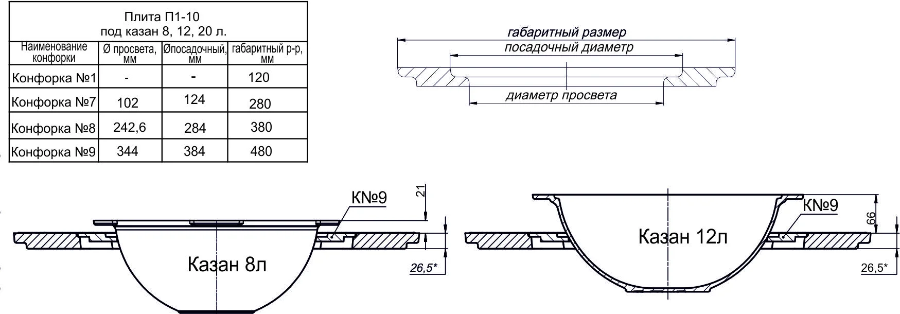 Комплектация конфорки: К№1(Ø120х20мм) – 1 шт., К№7(Ø280×14мм)– 1 шт., К№8(Ø380×14мм)– 1 шт., К№9 – 1 шт.
