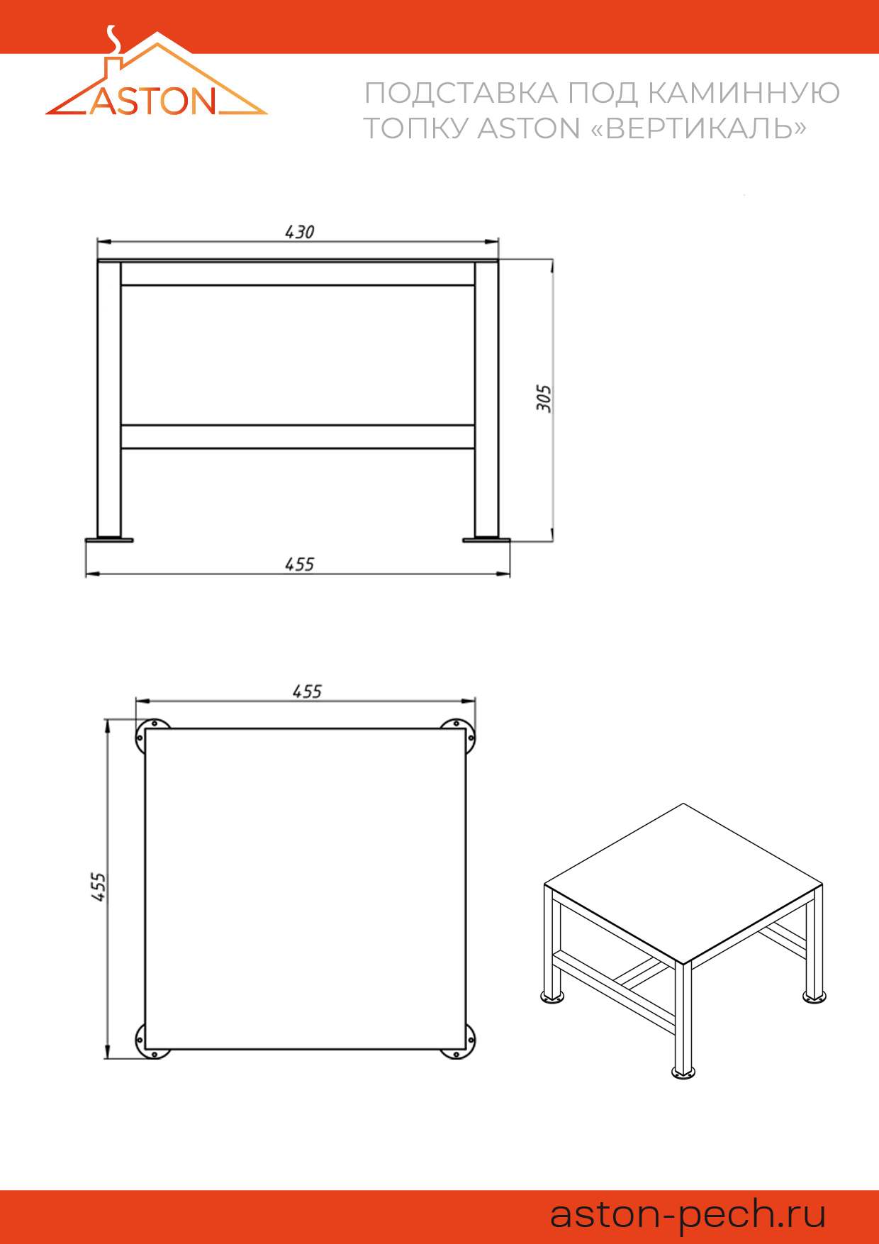 Конструкция подставки под каминную топку ASTON "Вертикаль" выполнена из прочной стали и окрашена черной матовой краской. Значительно упрощает монтаж топки, благодаря специальным элементам регулировки высоты в ножках подставки.