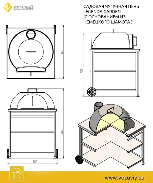 Нижний нагрев в печи Везувий Легенда Гарден реализован за счёт основания из немецкого шамотного камня. Тепло от горения дров или угля аккумулируют четыре камня размером четыреста три на триста миллиметров. Толщина камней тридцать миллиметров.