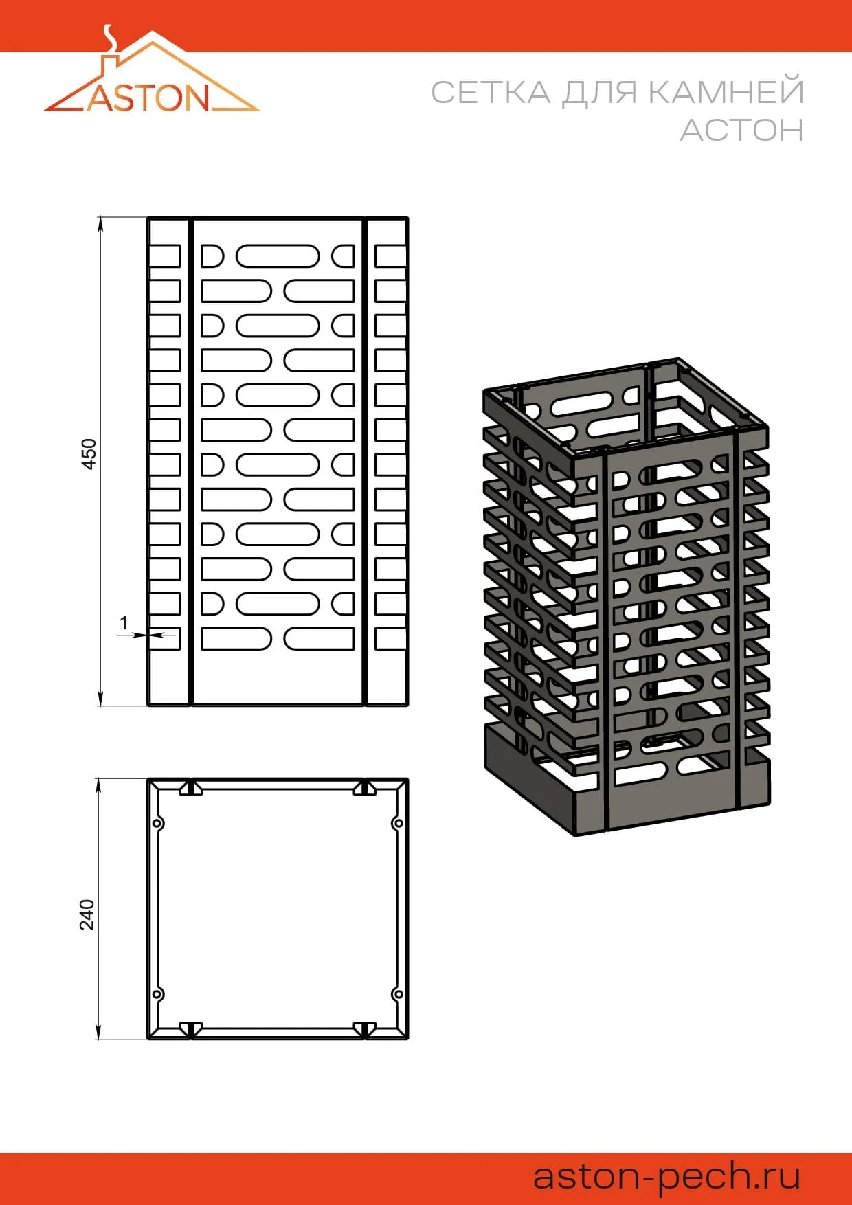 Сетка Астон сконструирована для установки на стартовый участок дымохода банных печей Астон. Предназначена для наполнения камнями и организации дополнительной открытой каменки в районе стартового участка дымохода.