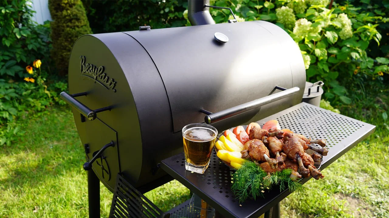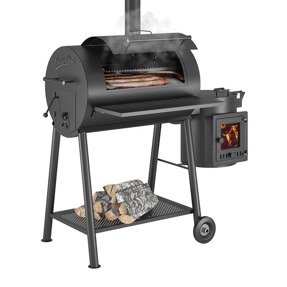 Для удобного использования на передней поверхности смокера сделана съёмная стальная полка для размещения продуктов и посуды. Смокер установлен на подставке с надёжными стальными ножками. В нижней части подставки сделана полка, на которой удобно хранить дрова и инструменты для работы со смокером. Две ножки смокера оснащены колёсами для удобства перемещения изделия по зоне барбекю. Для перекатывания смокера используется ручка на боковой стороне основного модуля смокера.