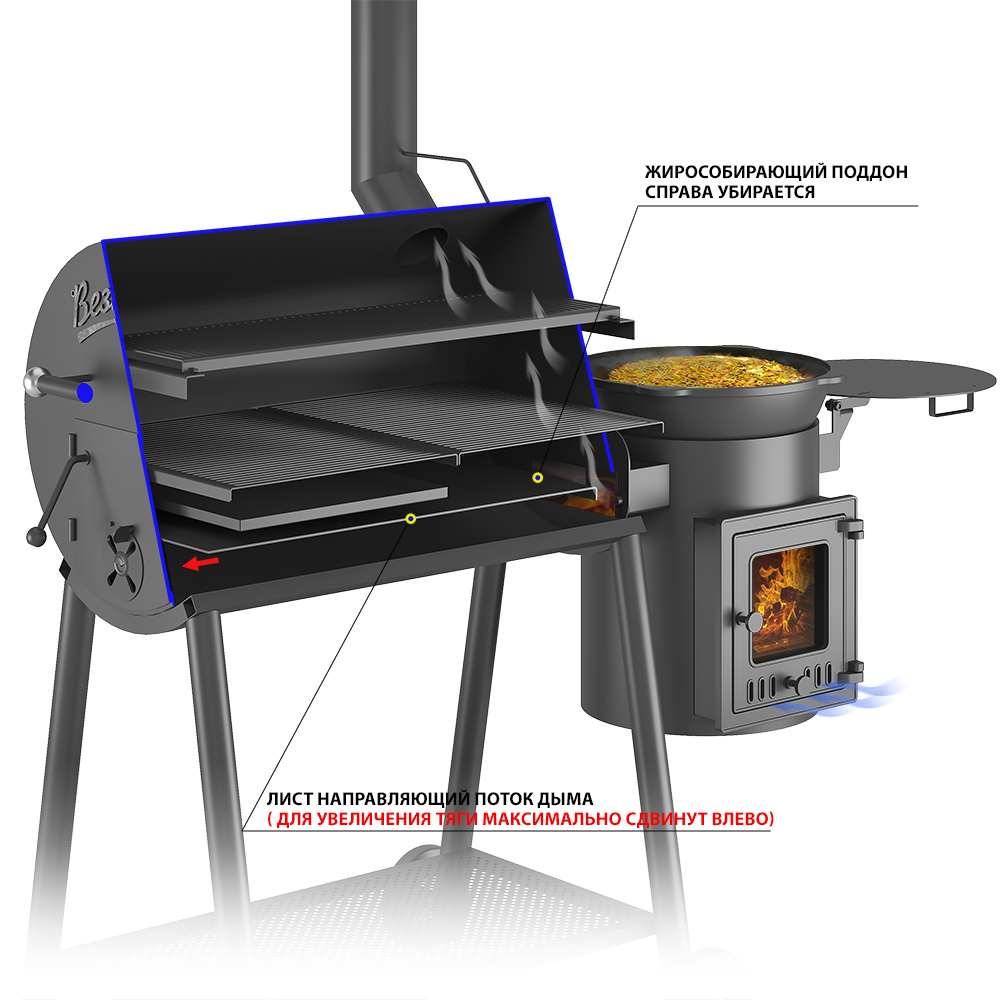Зола собирается в стальной поддон, уложенный на дно смокера. Основной модуль предназначен для использования в качестве мангала или барбекю, а также может быть использован в качестве коптильни для высокотемпературного копчения. Топливо размещается на поддонах из стали, продукты укладываются на решётки, где и происходит их приготовление.
