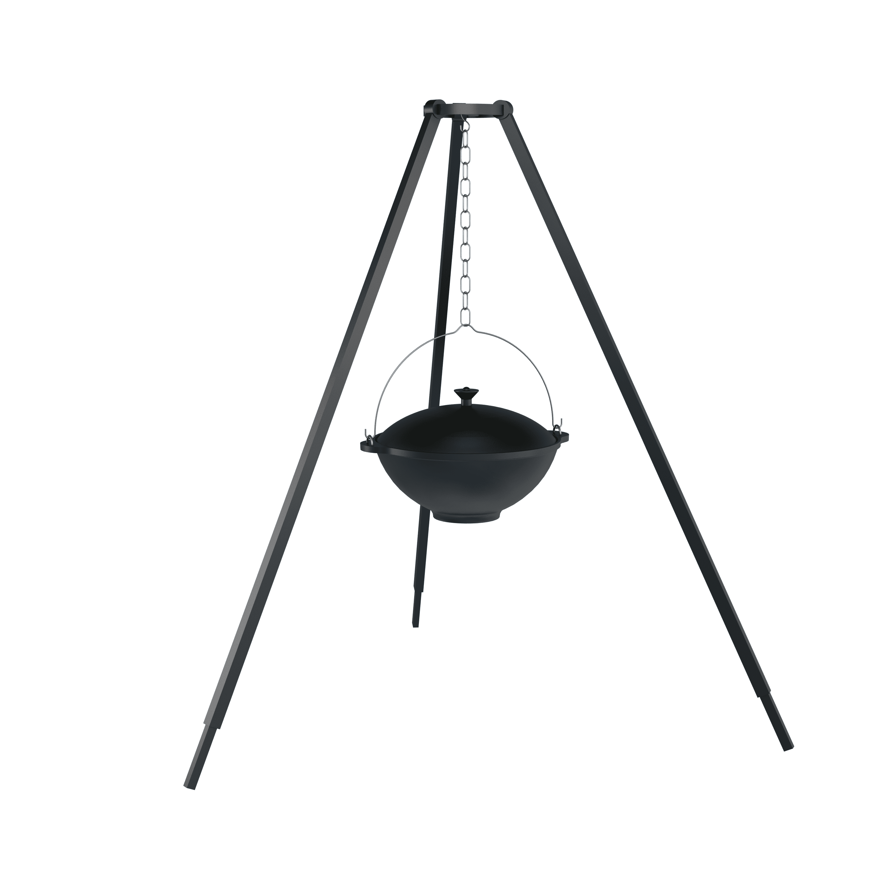 Это самая надежная и простая конструкция, которая очень ценятся во время походов. Имеет цепочку и крючок для того, чтобы регулировать высоту подвешивания посуды. Очень просто устанавливается над костром.