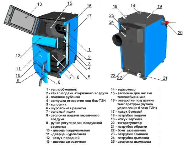 Дополнительный горизонтально расположенный теплообменник в комбинации со съемной заслонкой делают газоход трехходовым. Таким образом увеличивается площадь теплообмена и повышается эффективность теплоотдачи. Кроме того на газоходе расположен прочистной люк. который легко позволяет удалять сажу.