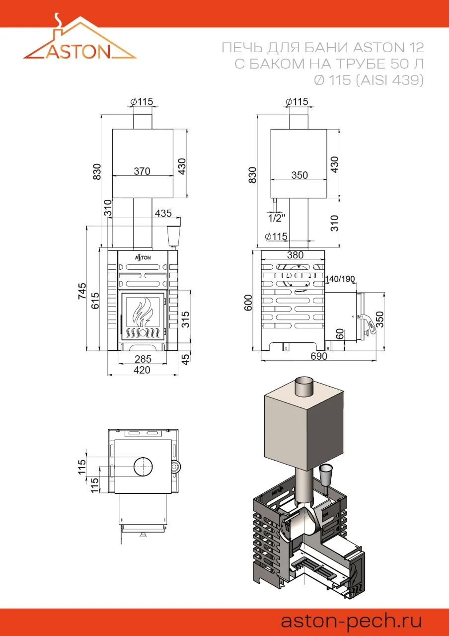 Печь для бани ASTON 12 с баком на трубе 50л Ø115 (AISI 439). Дровяная печь для бани из стали 09Г2С. Отапливает 14 м³. Каменка закрытая, вес камней 75 кг. Конструкция с кожухом-конвектором и чугунной колосниковой решеткой. Бренд для бюджетных парных.