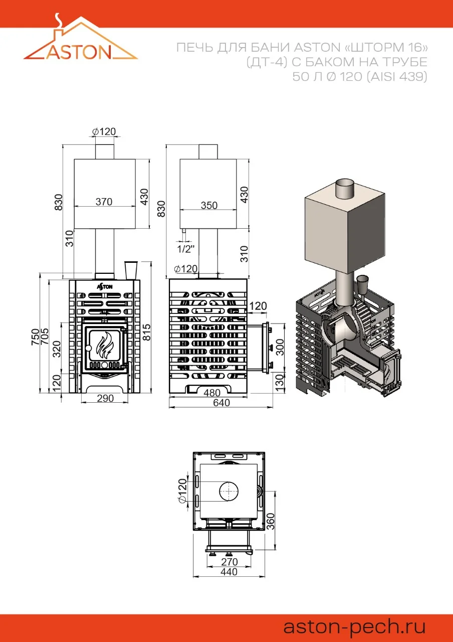 Печь для бани ASTON «Шторм 16» (ДТ-4) — дровяная печь для бани из чугуна. Отапливает до 16 м³. Имеет закрытую каменку из нержавеющей стали, бак на трубе 50л и тоннель для дров до 50 см.