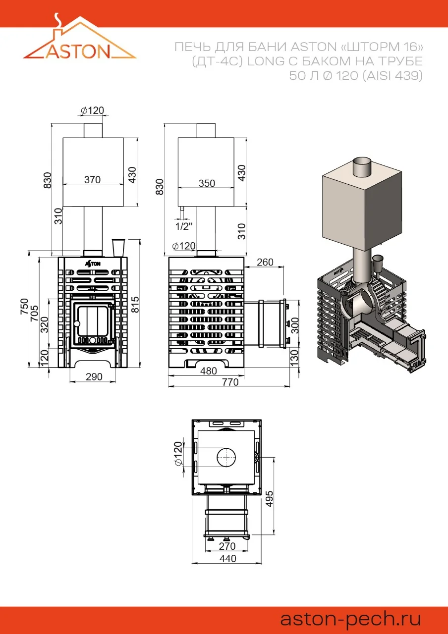 Печь для бани ASTON «Шторм 16» (ДТ-4С) Лонг — чугунная дровяная печь для бани с закрытой каменкой. Отапливает 16 м³. Бак на трубе 50 л. Вес камней — 115 кг. Конструкция с тоннелем для дров до 50 см.