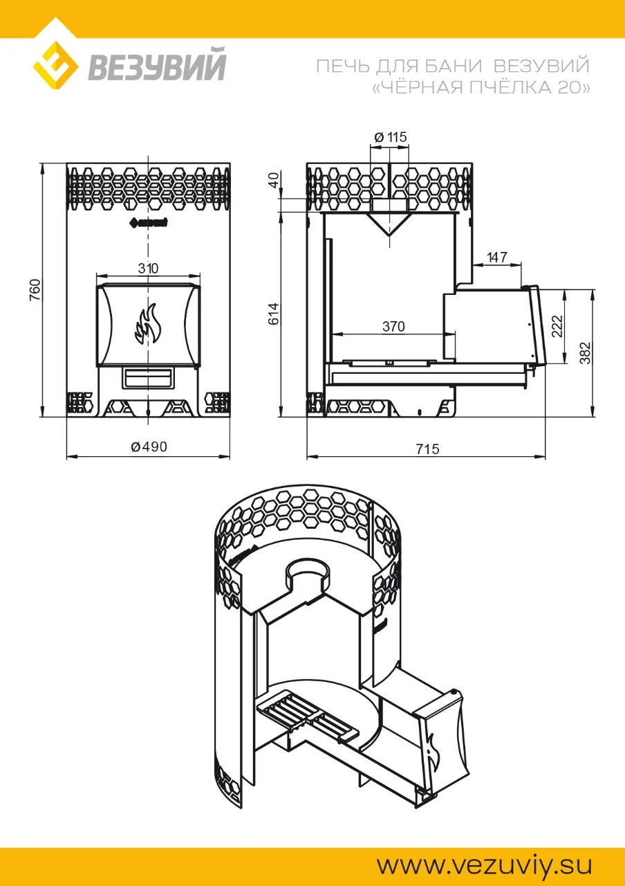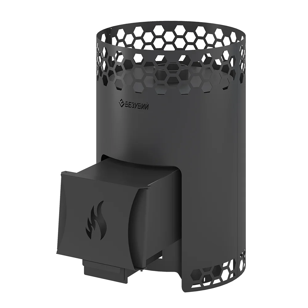 Печь для бани Везувий "Чёрная Пчёлка 20" — дровяная печь для бани из котловой стали 09Г2С. Корпус с сотами, дверь с угловой загрузкой. Есть версии со стеклом и без. Дополняется баком, подиумом, экраном. Открытая каменка, дымоход 115 мм.