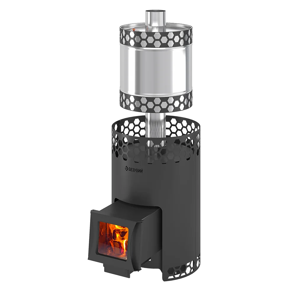 Печь сделана из особо прочной котловой стали марки 09Г2С с толщиной стенок от 3 до 4 мм. Дизайн корпуса печи выполнен в виде сот. Диаметр дымохода 115 мм. Дверка имеет правое и левое открытие. Улучшенная загрузка дров благодаря расположению двери под углом. Печи представлены как со стеклом, так и без него. Объем бака для воды 50 литров. Так же есть возможность дополнить печь подиумом высотой в 70 мм и фронтальным экраном.