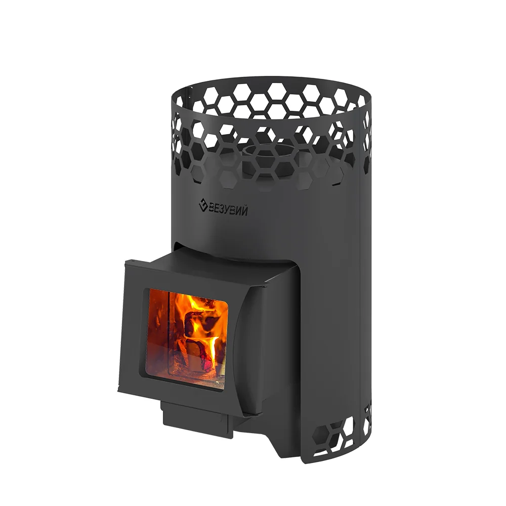 Печь для бани Везувий "Чёрная Пчёлка С" — дровяная печь для бани из котловой стали 09Г2С. Отапливает 14 м³. Корпус с сотами, дверь с угловой загрузкой. Есть версии со стеклом и без. Дополняется баком, подиумом, экраном.