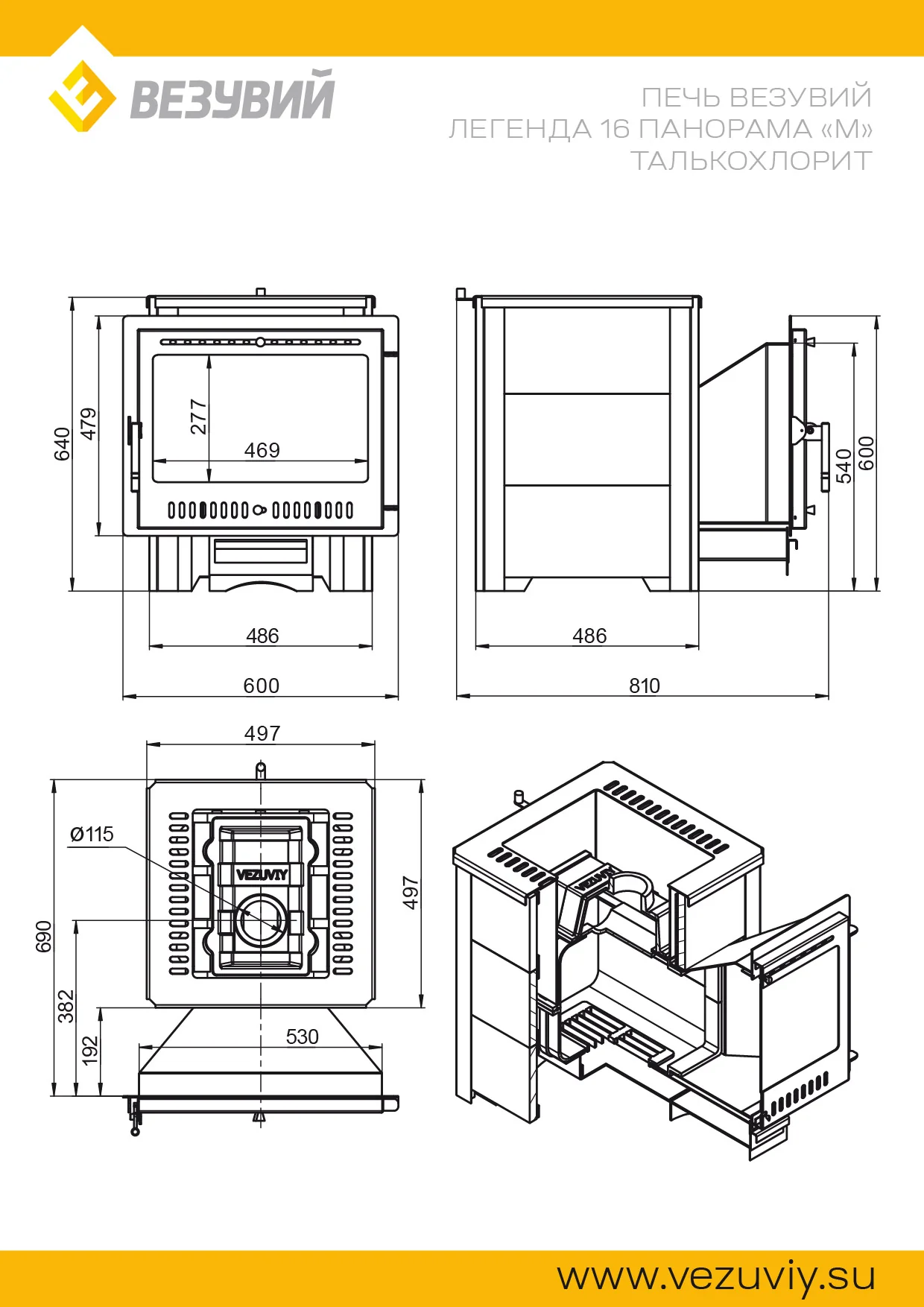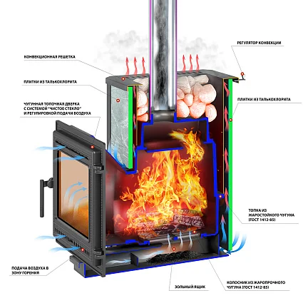 Преимущество печи в том, что топка печи состоит из 3-х ЧУГУННЫХ элементов. На стыке между ними используется керамический шнур с рабочей температурой 1200 градусов. То есть топка печи абсолютно герметична! Для фиксации деталей между собой применяется болтовое соединение, что даёт 100% гарантию безопасности при эксплуатации. Конвекционно–вентилируемая облицовка, изготовленная из экологически чистой горной породы , который обладает большой теплоёмкостью, что позволяет камню в короткие сроки нагреваться и максимально долго удерживать стабильную температуру в парильном помещении, а также гасить жёсткое инфракрасное излучение Камень обладает исключительными лечебными свойствами: помогает при головных болях, при нестабильном артериальном давлении, при простудных заболеваниях, воспалительных процессах в почках и пищеварительной системе, снимает повышенную возбудимость и нервозность, сглаживает эмоциональные всплески. Облицовка из натурального камня при нагреве способна аккумулировать тепло, что гарантирует максимально равномерный прогрев и сохранение тепла. Печь ВЕЗУВИЙ Легенда 16 Панорама "М" талькохлорит укомплектована чугунной каминной дверцей Везувий 505 с большим жаропрочным стеклом «SCHOTT ROBAX». Данная печь рассчитана на объем парильного помещения 8-18 м3.