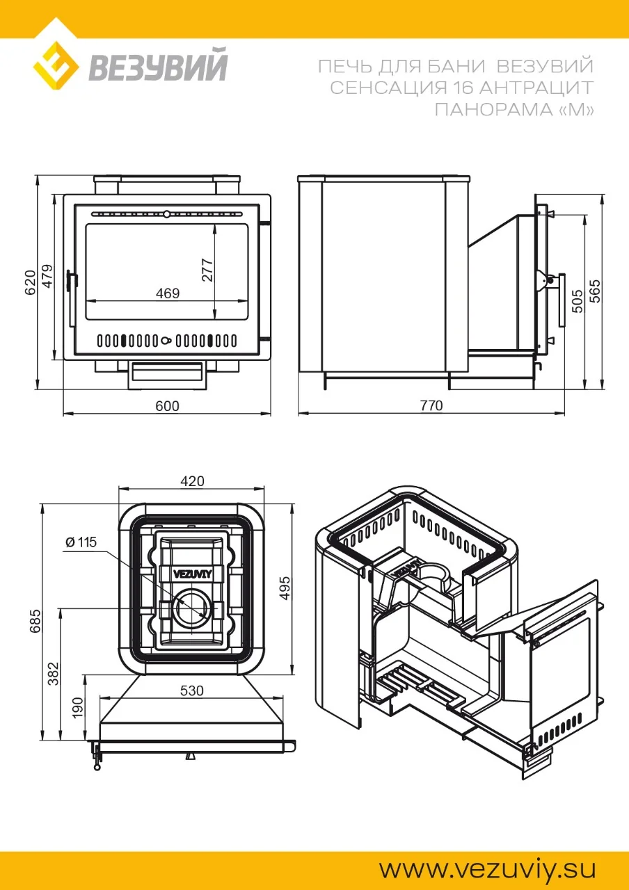Печь для бани ВЕЗУВИЙ Сенсация 16 Антрацит Панорама "М" — дровяная печь для бани из чугуна. Герметичная топка с керамическим шнуром. Объемная каменка на 60 кг камней нагревает парилку до 16 м³. Конвекционный кожух ускоряет нагрев воздуха.